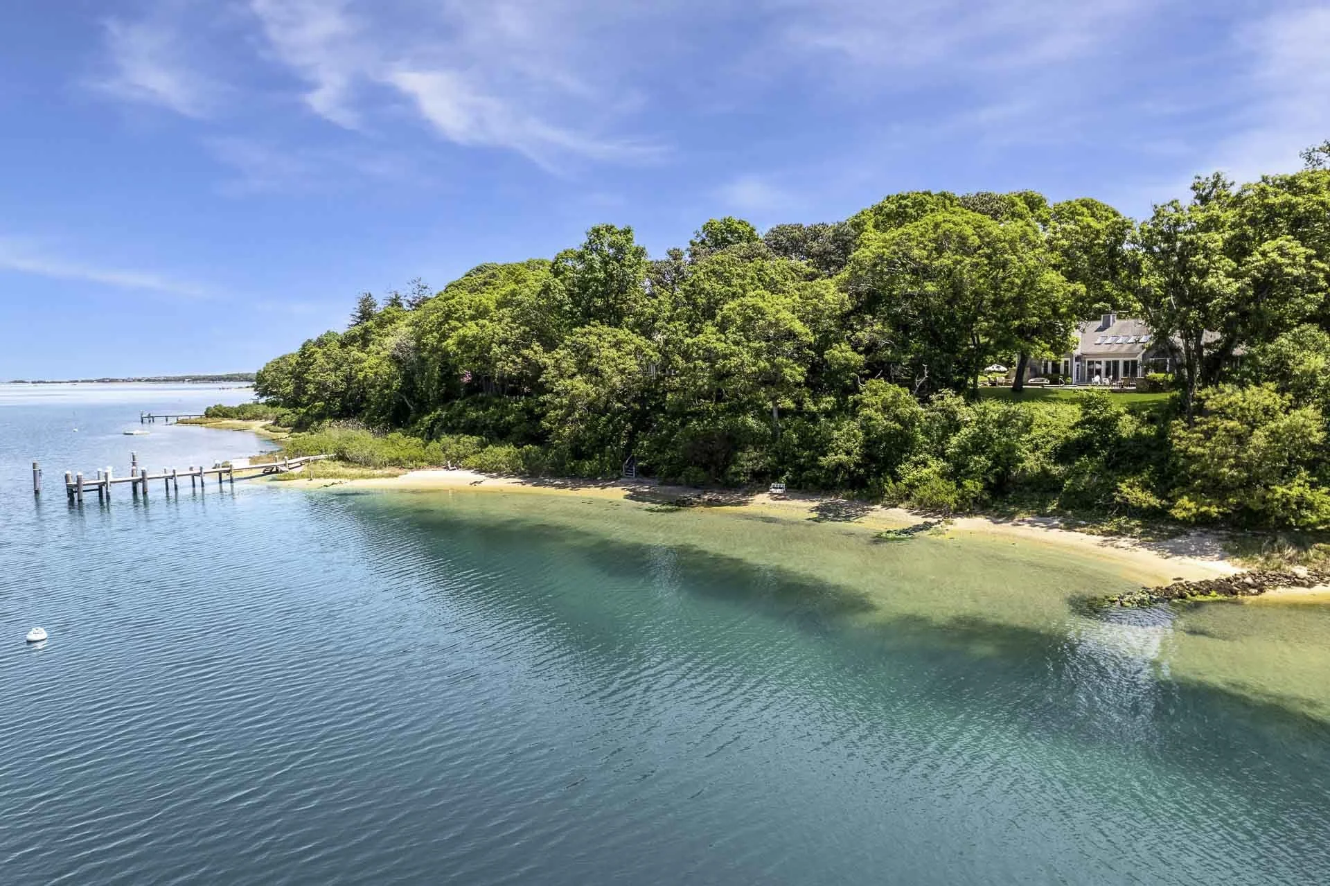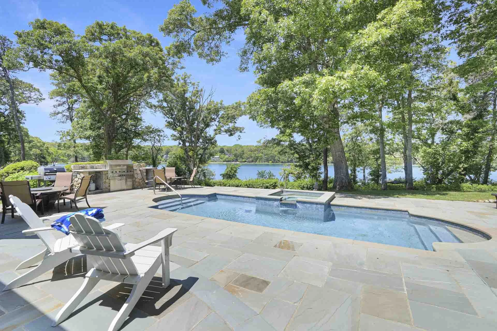 The heated pool, with a built-in whirlpool spa and bluestone terrace, is ideal for warm summer days. An outdoor kitchen invites alfresco dining, while a hammock offers a peaceful afternoon retreat. The lagoon waterfront, with stairs to a sandy beach, provides calm waters for swimming, kayaking, and paddleboarding, and the ability to secure a mooring.