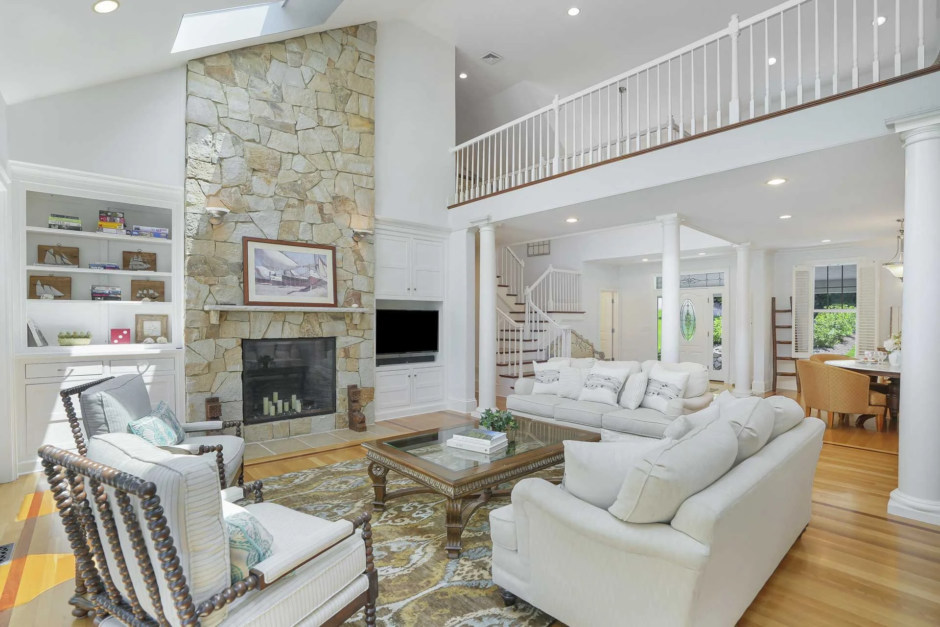 Luxurious island living awaits at this stunning private waterfront retreat, set on a private 125-foot stretch of sandy beachfront. Three floors of living space totaling 5,400+ square feet, seamlessly blend casual elegance with indoor-outdoor living. Enter through the grand foyer to discover dramatic interiors with soaring ceilings, skylights, and floor-to-ceiling windows that capture breathtaking water views. The open staircase and stately columns add grandeur, while a handsome stone fireplace and custom built-ins provide warmth and sophistication.
